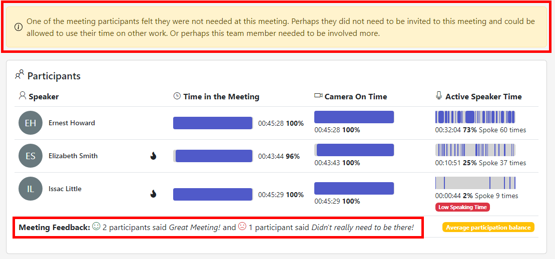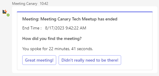 Meeting Canary collects feedback at the end of the meeting, to help identify participants who did not need to attend the meeting.