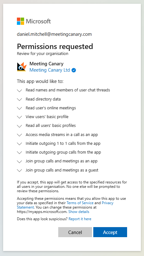By default Meeting Canary uses Resource-specific consent (RSC) permissions which allows for granting scoped access to an app. Through RSC, an authorized user can give Meeting Canary access to monitor the meeting they add the app to. They don’t need to give app access to the entire tenant.