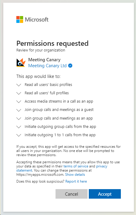 To be able to use Meeting Canary in all meetings including those created in teams and channels, additional Microsoft Graph permissions are required. When granting permission for the Meeting Canary Azure AD enterprise application, you will be presented with a set of Microsoft Graph permissions you must approve.